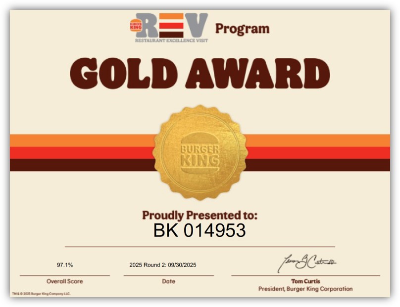 Congratulations to Our Burger King Team! We’re proud to announce that our Burger King team has earned the Gold Award Certificate for achieving an outstanding 97.1% Brand Standards score — including a perfect 100% in Food Safety! This recognition reflects our team’s commitment to excellence, quality, and guest satisfaction. Stop by the Burger King station in the Campus Center Food Court to see the award proudly displayed — and treat yourself to a delicious Whopper while you’re there!